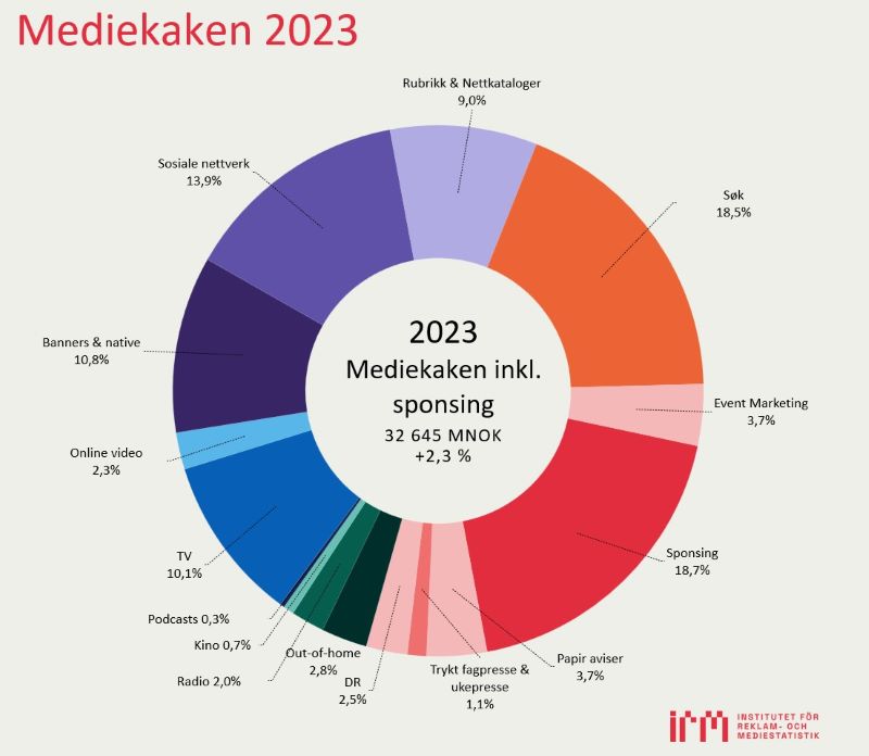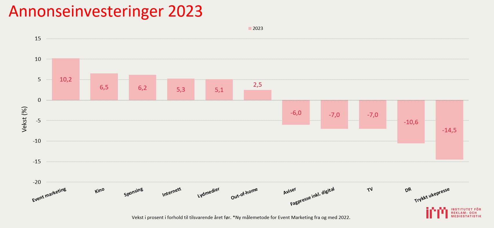 IRMs årsstatistikk er offisiell bransjestatistikk. Tabellerne viser samtlige reklameinvesteringer i penger, vekst sammenlignet med foregående år samt andel av reklamemarkedet.